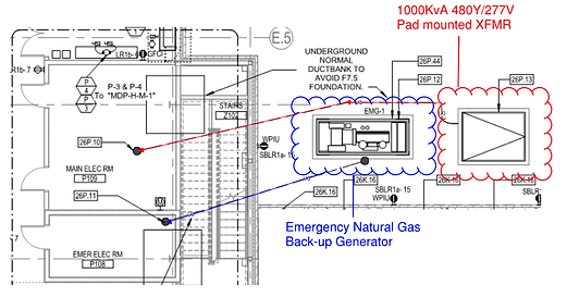 The electrical service to the building will be pulled from the existing main 15KV S&C vista switchgear. The power will be transferred to a 1000KvA pad-mounted transformer that is 3-phase and 4-wires 480Y/277 volt. From there, the power will be distributed via a 6-way underground ductbank from the outdoor transformer to an internal switchboard MDS located in the main electrical room, then transferred to 21 individual panelboards located throughout the building for localized power. There is also an emergency natural gas back-up generator located adjacent to the building and the main transformer. This generator has a 4-way underground ductbank from the generator to the emergency electrical room. See the following figure for more details.